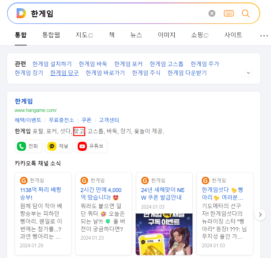 다음 검색창에 한게임 검색하신 한게임 맞고를 클릭하시면 다음 화면이 생성 됩니다.